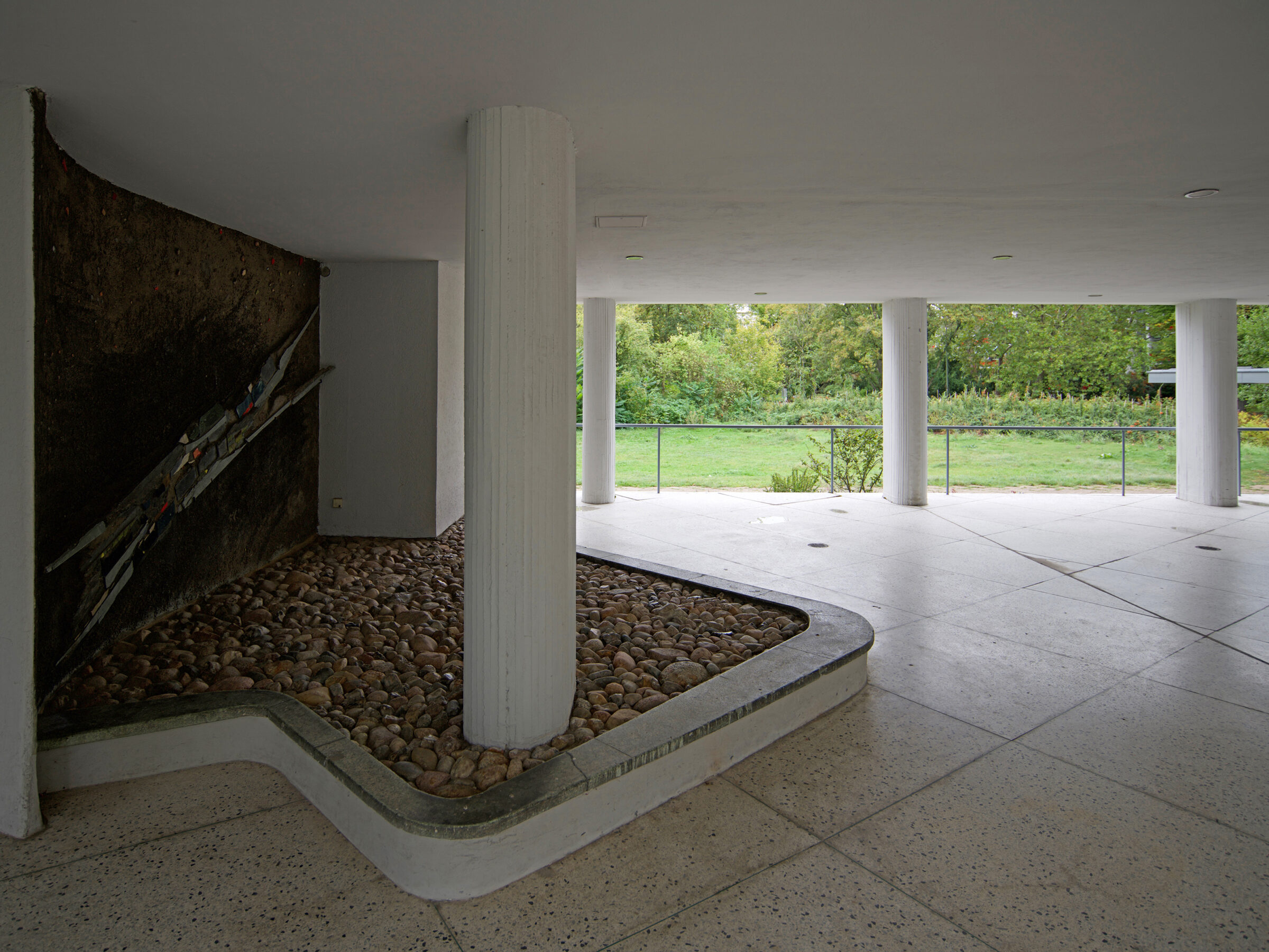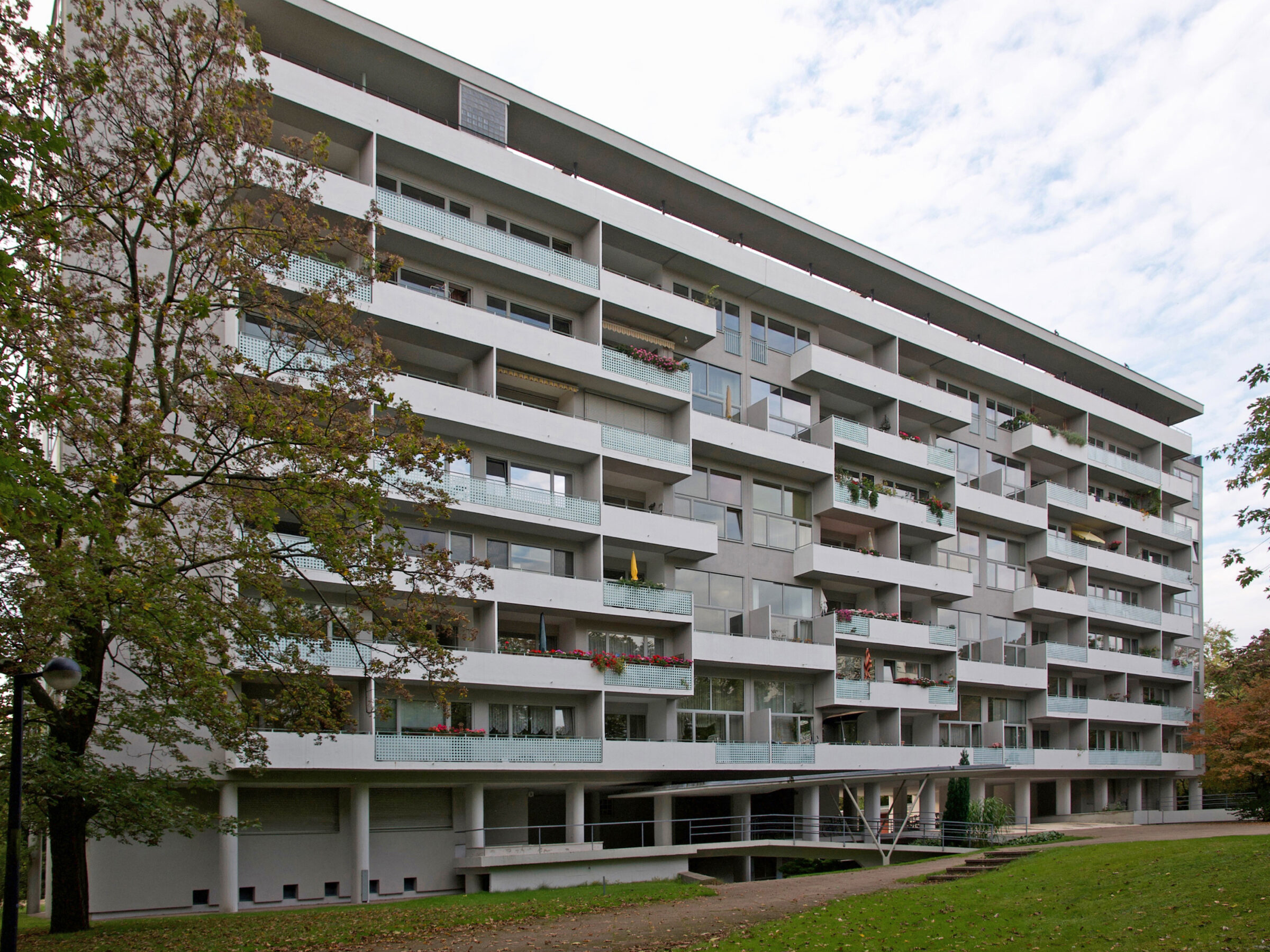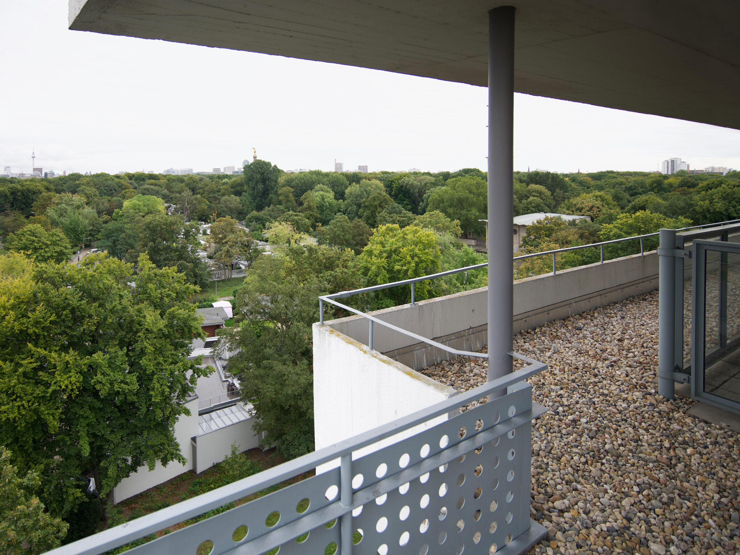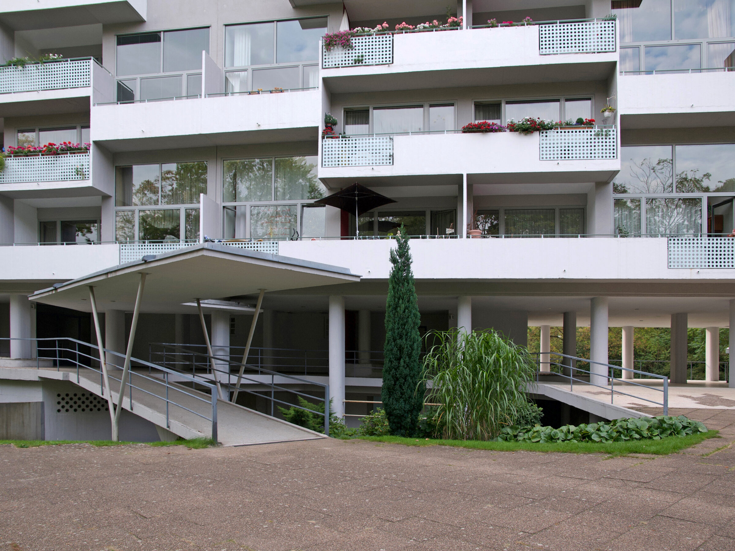 Der Wohnblock von Pierre Vago auf der Berliner Bauausstellung Interbau 1957 ist eine komplexe Split-Level-Konstruktion mit ein- und eineinhalbgeschossigen Wohnbereichen. Während bei einer vorigen Renovierung die farbigen Wandplatten aus Glas durch Blechpaneele ausgetauscht wurden, konzentrierte sich die neuere Maßnahme auf die denkmalgerechte Instandsetzung der Dachterrasse und die Betonsanierung. Ein zu niedriges bauzeitliches Geländer blieb erhalten bei Ergänzung eines von der Dachkante zurückgesetzten neuen Geländers.